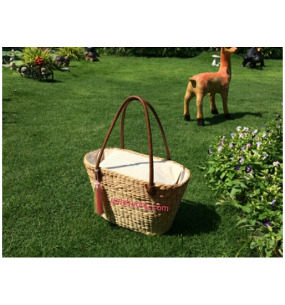 Giỏ lục bình oval quai simili nâu vàng, lót vải cotton mộc miệng dây kéo, bỏ vừa tập A4, kích thước : 37*16*H22cm