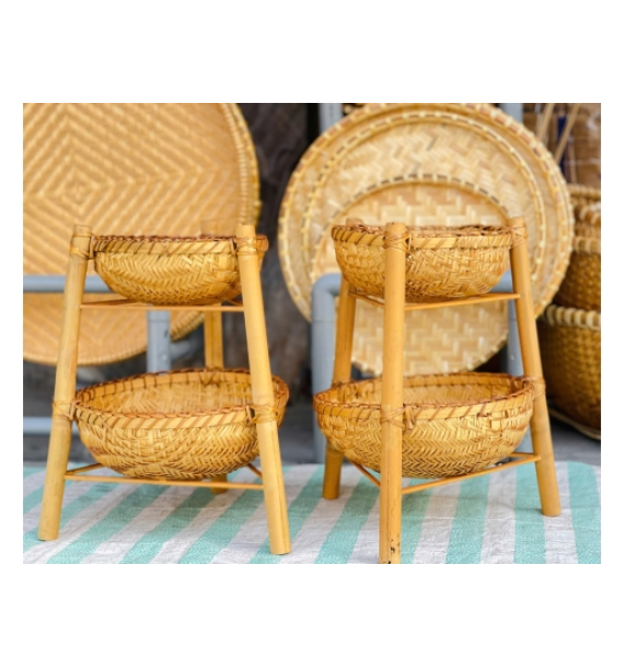 Kệ tre 2 tầng, rổ tre sâu, 3 chân vững chắc, đánh rửa nước được nên cực kỳ tiện lợi.